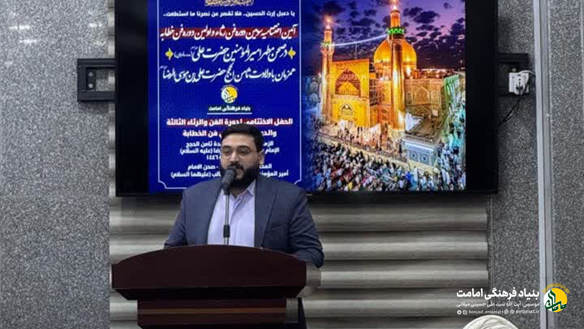 حجتالاسلام حسین رضایی قمی، از اساتید بنیاد امامت قم، در ابتدای مراسم، گزارشی از فعالیتهای بنیاد فرهنگی امامت ارائه داد. وی با اشاره به سابقه چندین ساله این بنیاد در پژوهشهای امامت گفت: “این مرکز به فکر تربیت مبلغانی افتاد که بتوانند مطالب امامتی را به شکل مؤثر ارائه دهند. برای این منظور، دو مهارت اصلی فن خطابه و فن رثاء ضروری بود تا طلاب بتوانند مجالس مهدوی و دیگر مجالس اهل بیت را به خوبی اداره کنند.”